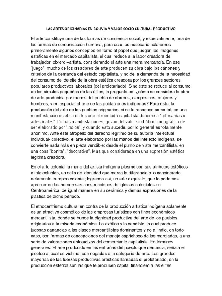 No se trata de reclamar lo justo o injusto;.. En todo caso, la categoría de "arte" es un canon bajo la simbología ideológica del ejercicio del poder occidental; Artes originarias sus valores cultura y produccion. El arte constituye una de las formas de conciencia social, y especialmente, una de las formas de comunicacin humana, para esto, es necesario aclararnos primeramente algunos conceptos en torno al papel que juegan las imgenes estticas en el mercado capitalista, el cual reduce a la labor creadora del trabajador, obrero artista, considerando el. No se trata de reclamar lo justo o injusto; En todo caso, la categoría de "arte" es un canon bajo la simbología ideológica del ejercicio del poder occidental;